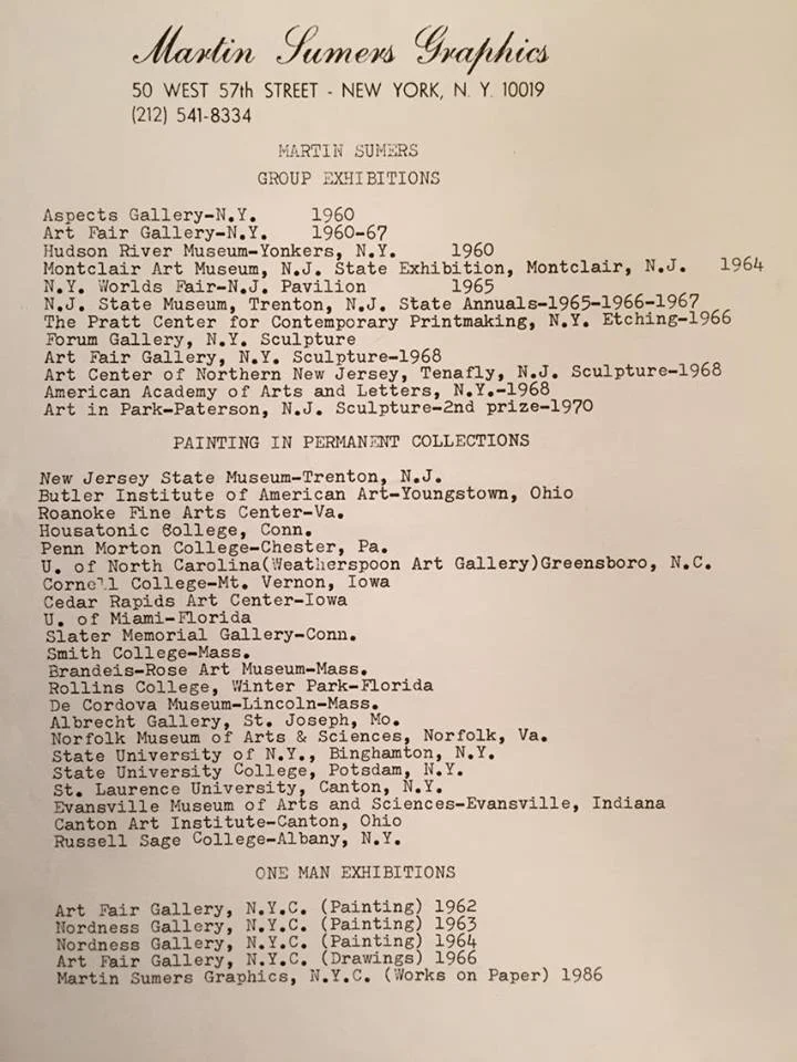 Aspects Gallery 1960; Art Fair Gallery 1960-1967; Hudson River Museum 1960; Montclair Art Museum 1964, 1967; New York Worlds Fair 1965; New Jersey State Museum State Annuals 1965, 1966, 1967; The Pratt Center for Contemporary Printmaking 1966; Forum Gallery, Sculpture; Art Fair Gallery Sculpture 1968; Art Center of Northern New Jersey 1968; American Academy of Arts and Letters 1968; Art in Park in Paterson NJ, Sculpture, 2nd. prize 1970